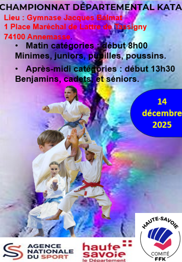 Mesdames, Messieurs les présidents de clubs, Le comité départemental de Karaté et disciplines associées de la Haute-Savoie, a le plaisir de vous informer que la coupe départementale ainsi que le championnat départemental KATA, auront lieu le dimanche 14 Décembre 2025. Lieu : Gymnase Jacques Balmat – 1 Place Maréchal de Lattre de Tassigny – 74100 Annemasse. Coupe et [...]