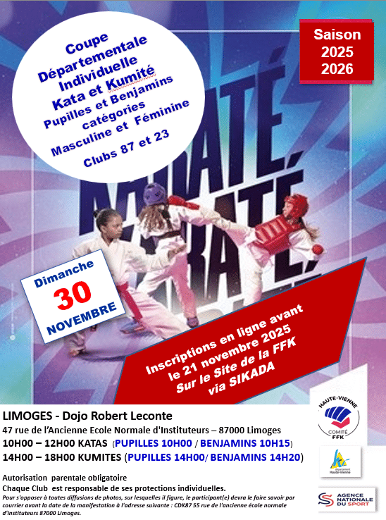 Dimanche 30 Novembre 2025 Coupe Départementale Individuelle (clubs 87 et 23) KATA / KUMITE catégories Pupilles et Benjamins (masculine et féminine). Inscriptions en ligne obligatoire sur le site de la FFK – via SIKADA – avant le vendredi soir 21 novembre 2025 dernier délai. Dojo départemental Robert Leconte à Limoges. Cliquez ci-dessous sur “En savoir Plus” pour télécharger l’affiche, l’autorisation parentale et avoir plus de renseignements.