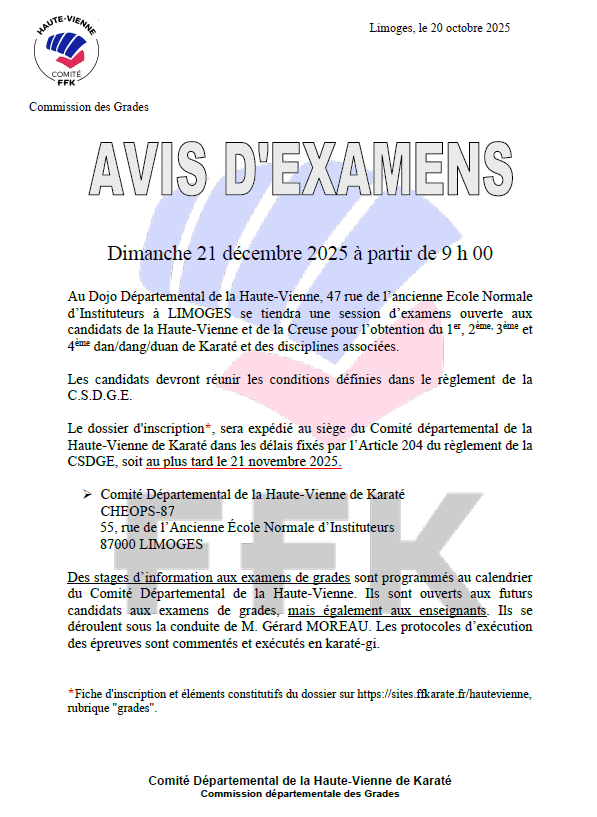 EXAMEN PASSAGES DE GRADES du 1er au 4ème dan DIMANCHE 21 DECEMBRE 2025 à partir de 9H00 – session ouverte aux candidats de la Haute-Vienne et de la Creuse de Karaté et disciplines associées. Cette information est communiquée aux Candidats et aux Professeurs pour anticiper les préparations. Le dossier d’inscription doit être expédié au siège du Comité Départemental Haute-Vienne au plus tard le 21 novembre 2025. RAPPEL : stage d’informations de passage des grades ouvert aux pratiquants à partir du 1er Kyu et aux Professeurs sous la conduite de Gérard MOREAU, Responsable de la Commission des Grades DK87, le DIMANCHE 23 novembre 2025 (9H00-12H00) au Dojo Robert LECONTE de Limoges (47 rue de l’Ancienne Ecole Normale d’Instituteurs 87000 LIMOGES). Cliquez ci-dessous sur « En savoir plus ».