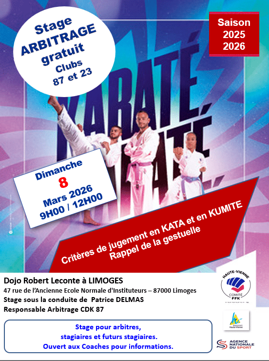 STAGE ARBITRAGE du CDK 87 (87 et 23) le DIMANCHE 8 MARS 2026 (9H00/12H00) pour les Arbitres, stagiaires et futurs stagiaires. Le stage est ouvert aux coaches pour informations. Thèmes : critères de jugement en KATA et en KUMITE, rappel de la gestuelle. Dojo Robert LECONTE – 47 rue de l’Ancienne Ecole Normale d’Instituteurs 87000 LIMOGES. Cliquez ci-dessous sur « En savoir plus » pour télécharger l’affiche.