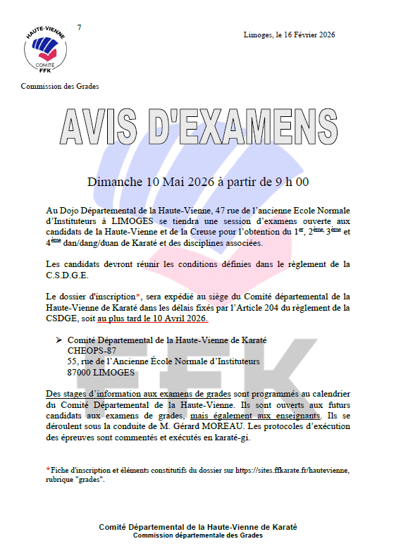 EXAMEN PASSAGES DE GRADES du 1er au 4ème dan DIMANCHE 10 MAI 2026 à partir de 9H00 – session ouverte aux candidats de la Haute-Vienne et de la Creuse de Karaté et disciplines associées. Cette information est communiquée aux Candidats et aux Professeurs pour anticiper les préparations. Le dossier d’inscription doit être expédié au siège du Comité Départemental Haute-Vienne au plus tard le 10 AVRIL 2026. RAPPEL : stage d’informations de passage des grades ouvert aux pratiquants à partir du 1er Kyu et aux Professeurs sous la conduite de Gérard MOREAU, Responsable de la Commission des Grades CDK87, le DIMANCHE 15 MARS 2026 (9H00-12H00) au Dojo Robert LECONTE de Limoges (47 rue de l’Ancienne Ecole Normale d’Instituteurs 87000 LIMOGES). Cliquez ci-dessous sur « En savoir plus » pour télécharger l’avis d’examen et la fiche d’inscription.