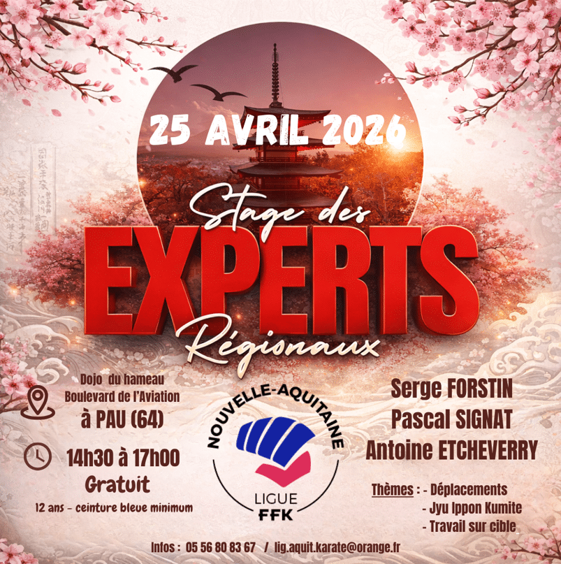 25 avril 2026 Stage gratuit des EXPERTS Régionaux organisé par la Ligue FFK Nouvelle Aquitaine au Dojo du Hameau Boulevard de l’Aviation à PAU (64) 31 mars 2026 FFK Karaté Stages