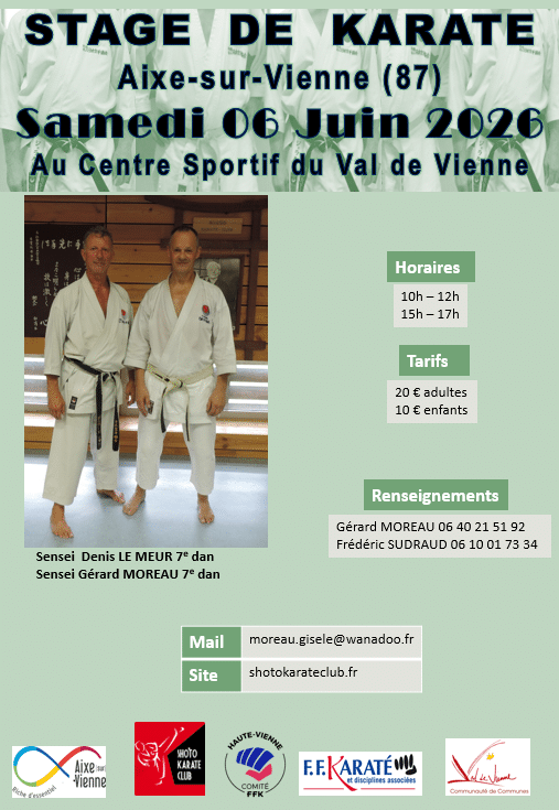 STAGE KARATE le samedi 6 juin 2026 (10H00-12H00 et 15H00-17H00) au Centre Sportif du Val de Vienne à AIXE SUR VIENNE sous la conduite de Denis Le MEUR 7ème Dan, Gérard MOREAU 7ème Dan. Télécharger l’affiche du stage en cliquant ci-dessous sur « en savoir plus ».