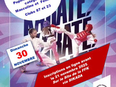 Dimanche 30 Novembre 2025 Coupe Départementale Individuelle (clubs 87 et 23) KATA / KUMITE catégories Pupilles et Benjamins (masculine et féminine). Inscriptions en ligne obligatoire sur le site de la FFK – via SIKADA – avant le vendredi soir 21 novembre 2025 dernier délai. Dojo départemental Robert Leconte à Limoges. Cliquez ci-dessous sur “En savoir Plus” pour télécharger l’affiche, l’autorisation parentale et avoir plus de renseignements.