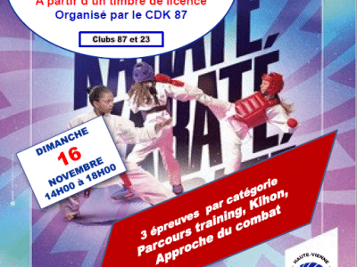 ANIMATION SPORTIVE du CDK 87 (clubs 87 et 23) le Dimanche 16 NOVEMBRE 2025 de 14H00 à 18H00 ouvert aux enfants des catégories (masculin et Féminine) POUSSINS, PUPILLES et BENJAMINS à partir d’un timbre de licence (première année de Karaté acceptée). Dojo Robert LECONTE 47 rue de l’Ancienne Ecole Normale d’Instituteurs 87000 Limoges. Cliquez ci-dessous sur “En savoir plus” pour le déroulé des épreuves et télécharger l’affiche.