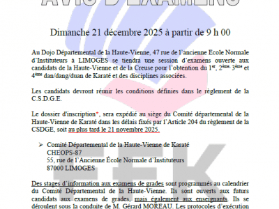 DIMANCHE 23 novembre 2025 de 09H00 à 12H00, STAGE GRATUIT D’INFORMATION pour les PASSAGES DE GRADES du 1er au 4ème Dan, organisé par la Commission des Grades du CDK 87 sous la responsabilité Monsieur Gérard MOREAU. Dojo Robert LECONTE (47 rue de l’Ancienne Ecole Normale d’Instituteurs 87000 LIMOGES). Important: la présence des JUGES est indispensable pour être référencés et convoqués pour la saison 2025/2026. Tous les professeurs des clubs sont invités à ce stage.