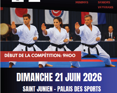 OPEN DEPARTEMENTAL du CDK 87 (Départements 87 et 23) KATA et KUMITE en POUSSINS, PUPILLES et BENJAMINS (masculins et féminines) le DIMANCHE 26 AVRIL 2026 de 09H30 à 18H00 au Dojo Robert LECONTE à LIMOGES. Inscriptions en ligne sur le site de la FFK via SIKADA avant le vendredi 17 avril 2026 au soir. Les inscriptions devront se faire sur les deux compétitions : OPEN COMBATS 87 et OPEN KATAS 87. Rappel PAIEMENT DES INSCRIPTIONS application d’un tarif unique de 3€ pour l’inscription d’un licencié à la compétition. Le règlement se fera en chèque à l’ordre du CDK87 par chaque club à la table de contrôle. Prenez connaissance des informations de la compétition en cliquant ci-dessous sur « En savoir plus » et téléchargez l’affiche et l’autorisation parentale.