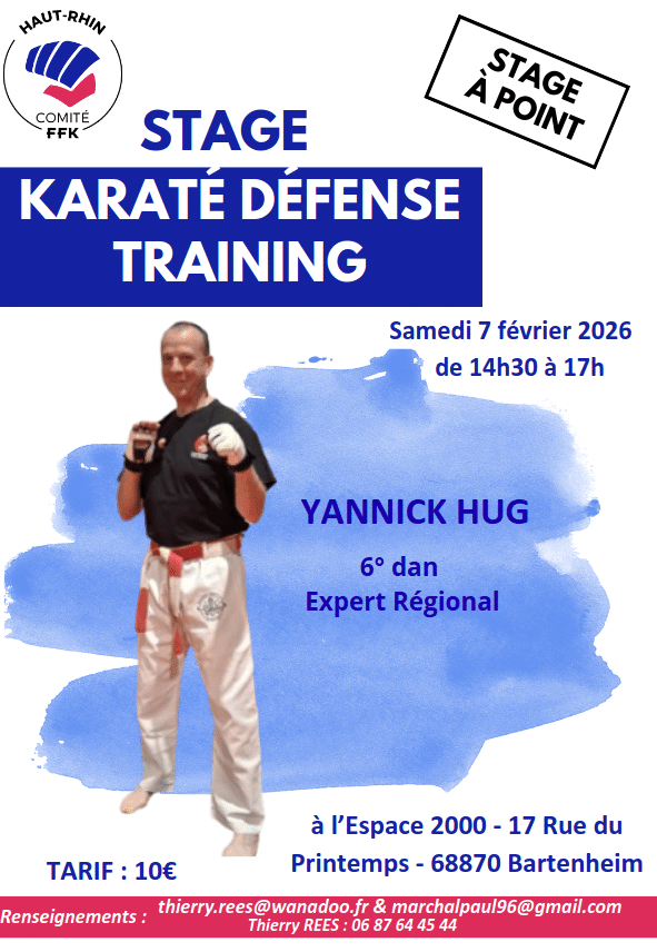 stage à points karaté défense training Date Sam. 7 Février 2026 de 14h30 à 17h Lieu Espace 2000, 17 rue du Printemps BARTENHEIM