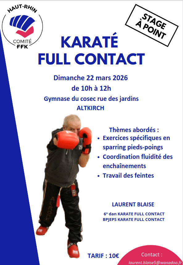 Stage départemental karaté full contact Date Dim. 22 Mars 2026 de 10h à 12h Lieu Gymnase du COSEC rue des jardins - Altkirch