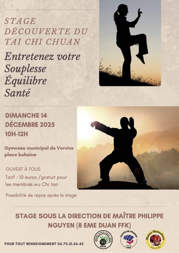 Stage découverte du Tai Chi Chuan offert par la ligue HDFKDA ouvert à toutes et tous. Dimanche 14 décembre 2025 de 10h à 12h Gymnase municipal de Vervins place Behaine à VERVINS.
