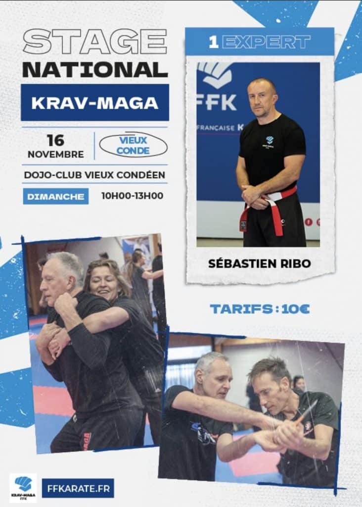 Stage de KRAV-MAGA à Vieux Condé de 10h00 à 13h00 avec Sébastien RIBO Expert Fédéral FFK. Dojo-Club de Vieux Condé, Complexe sportif rue du 8 Mai 1945 à 59690 Vieux-Condé. Inscriptions en ligne site FFK SIKADA