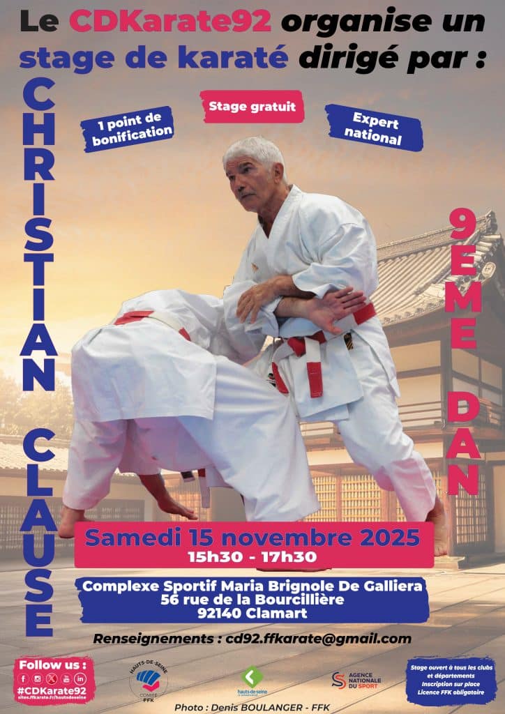 Le CDKarate92 organise un stage de Karaté avec Christian CLAUSE (9ème dan – expert national) le samedi 15 novembre 2025 de 15h30 à 17h30.