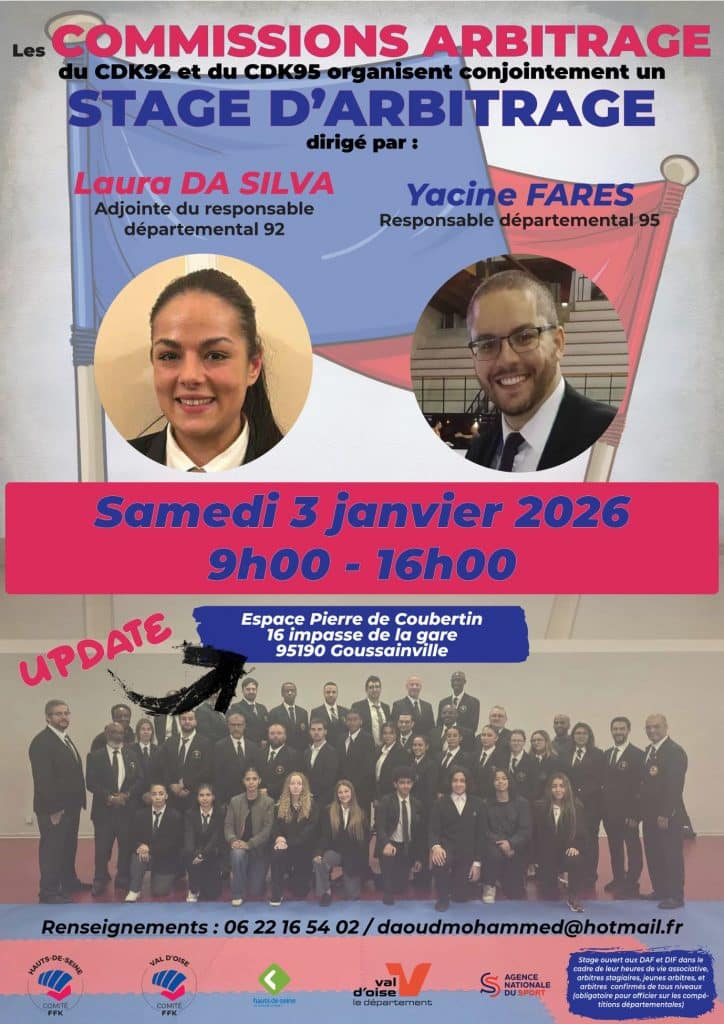 La commission arbitrage du CDKarate92 en co-organisation avec le CDKarate95 vous propose un stage d’arbitrage le samedi 3 janvier 2026 de 9h00 à 16h00.