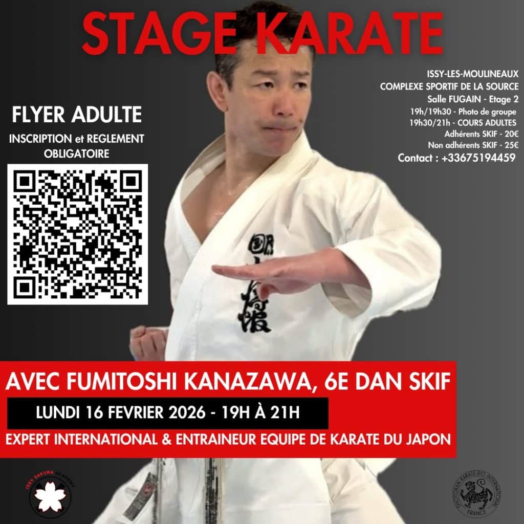 Le lundi 16 janvier 2026, de 19h00 à 21h00, l’association Issy Sakura Academy organise un événement exceptionnel : un stage de Karaté Shotokan animé par Fumitoshi KANAZAWA, 6ème Dan SKIF.