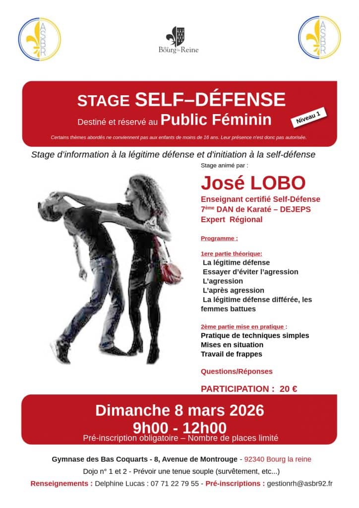 L’ASBR organise un stage de self-défense féminine animé par José LOBO (7ème dan – enseignant certifié Self-Défense) le dimanche 8 mars 2026 de 9h00 à 12h00.