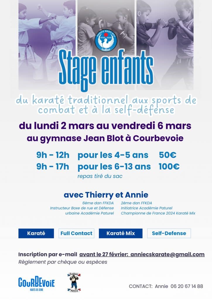 Le Courbevoie Sports Karaté propose un stage enfant de Karaté avec Thierry PERBAL (6ème dan) et Annie BASILE (2ème dan), du lundi 2 au vendredi 6 mars 2026.