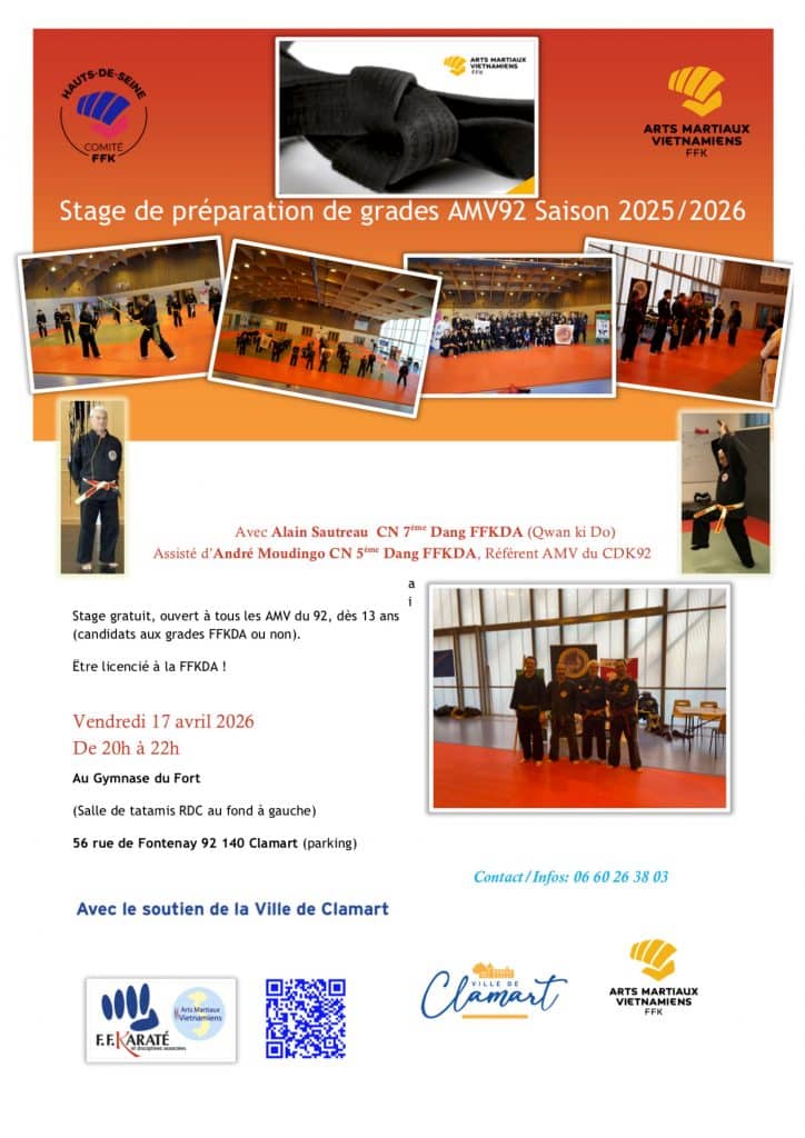 Le vendredi 17 avril 2026, le Comité départemental de Karaté des Hauts-De-Seine vous propose un stage de préparation et d’information aux grades AMV à Clamart de 20h00 à 22h00.