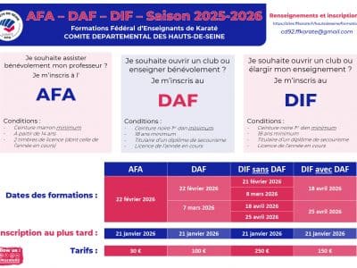 Le Comité Départemental des Hauts-De-Seine de Karaté lance sa nouvelle campagne de formation pour les AFA, DAF et DIF saison 2025 – 2026.