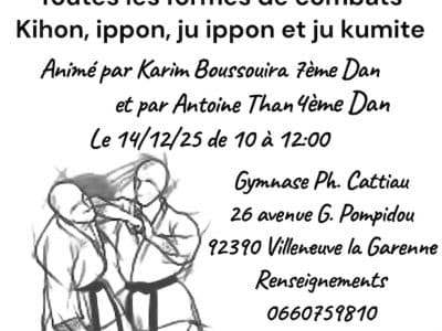 Le dimanche 12 octobre 2025, Karim BOUSSOUIRA (7ème dan) et Antoine THAN organisent un stage de karaté à Villeneuve-La-Garenne de 10h00 à 12h00.