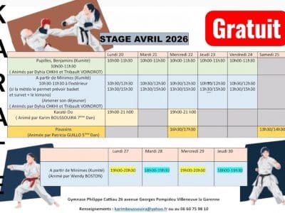 Le Shotokan Club de Villeneuve-La-Garenne vous propose un stage pour tous les âges et niveaux à Villeneuve-La-Garenne du lundi 20 au jeudi 30 avril 2026.