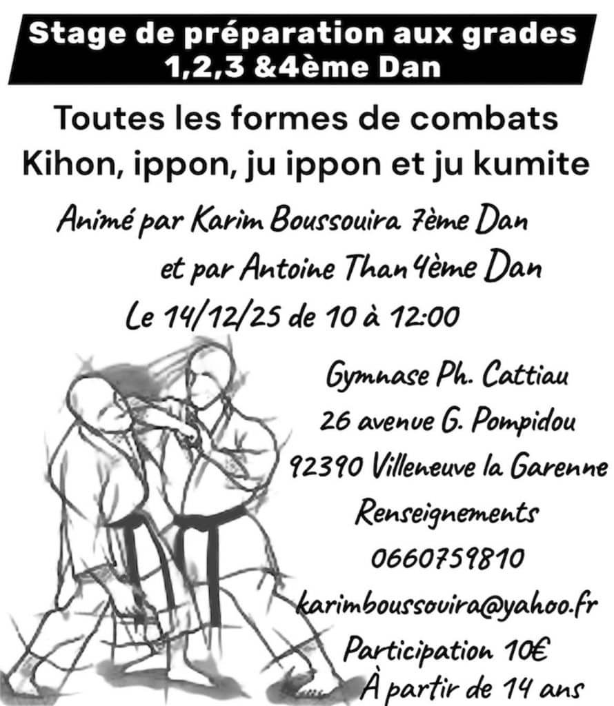 Le dimanche 12 octobre 2025, Karim BOUSSOUIRA (7ème dan) et Antoine THAN organisent un stage de karaté à Villeneuve-La-Garenne de 10h00 à 12h00.