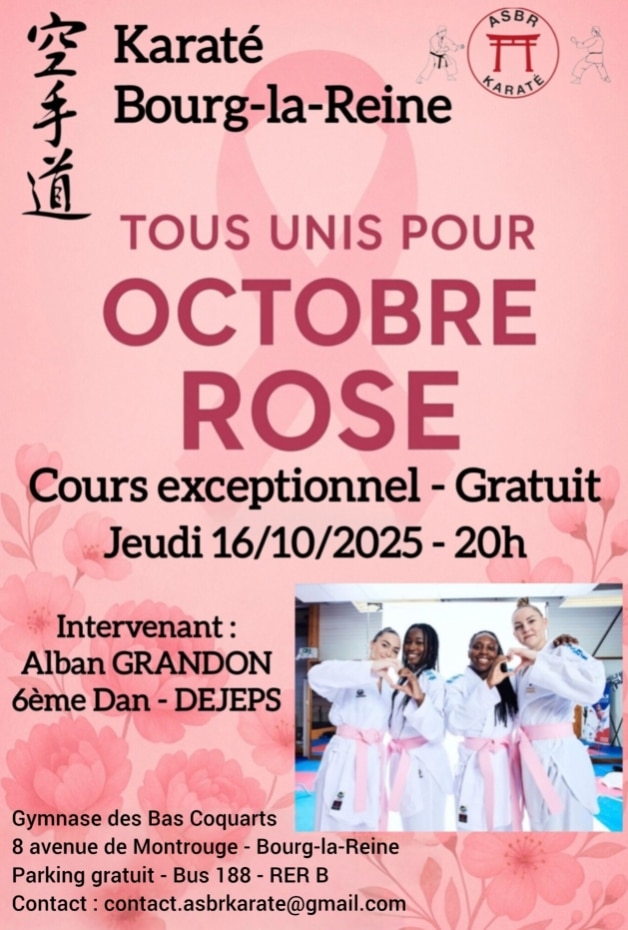 Le club de karaté Bourg-La-Reine vous propose à l’occasion d’Octobre Rose un stage de Karaté avec Alban GRANDON (6ème dan) à Bourg-La-Reine le jeudi 16 octobre 2025 à partir de 20h00.