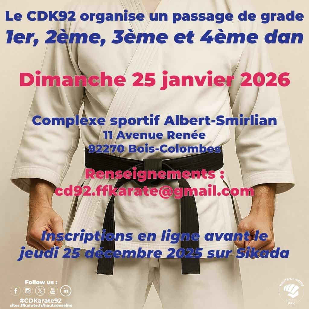 Le Comité Départemental des Hauts-De-Seine de Karaté organise un passage de grade pour les 1er, 2ème, 3ème et 4ème dan le dimanche 25 janvier 2026.