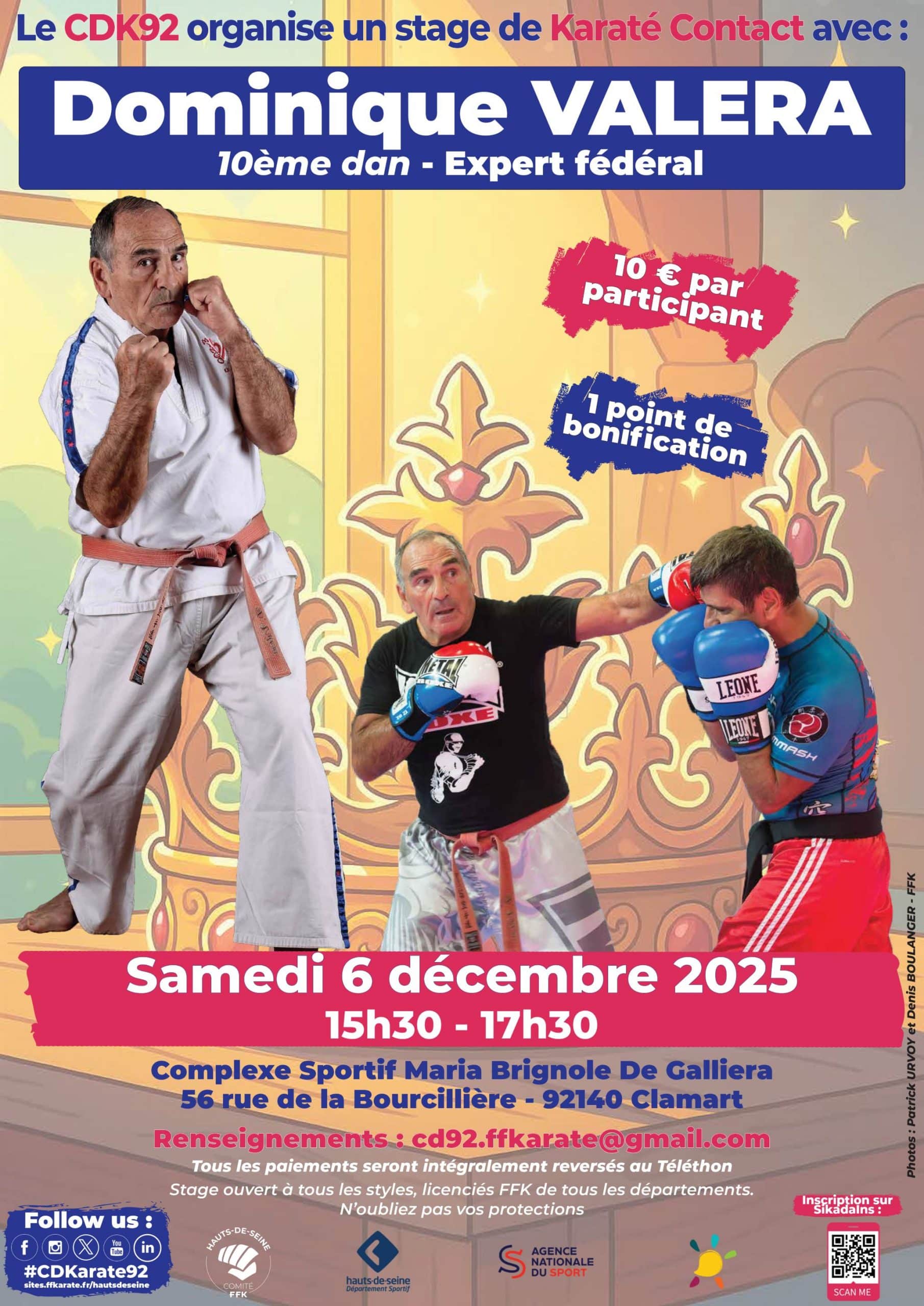 Le CDKarate92 organise un stage de Karaté Contact avec la présence de Dominique VALERA (Expert Fédéral – 10éme Dan), le samedi 6 décembre 2025 de 15h30 à 17h30.