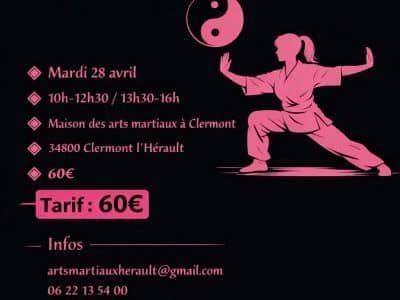 Mardi 28 Avril Stage Tai Chi dirigé par Sophie Fouchet A la Maison des Arts Martiaux de Clermont l'Hérault 10h30 - 12h30 /13h30 -16h00
