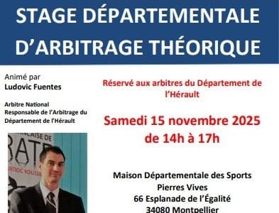 Stage d'arbitrage réservé aux arbitres de l'Hérault samedi 15 Novembre 2025 à la Maison Départementale des Sports de Montpellier.Stage exceptionnel de Karaté