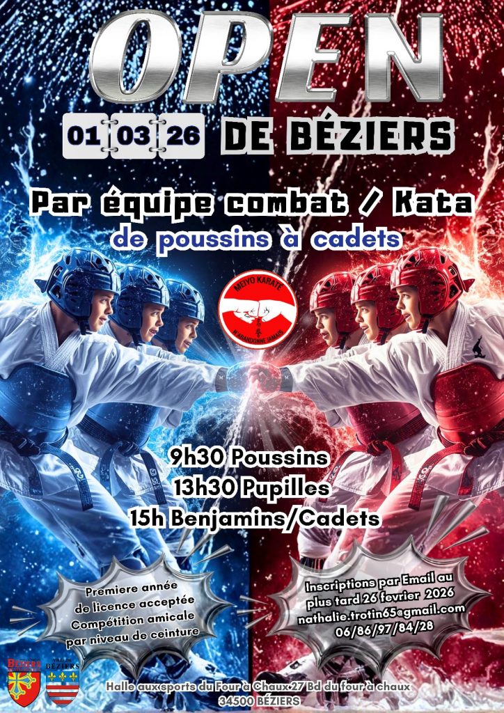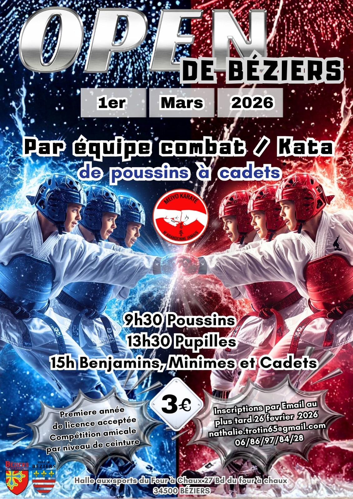 OPEN de Béziers (Equipes) Date Dim. 1 Mars 2026 Lieu Gymnase du Four à chaux - BEZIERS (34) Combat par équipes de 3 : Ouvert à tous les enfants de Poussins à Cadets