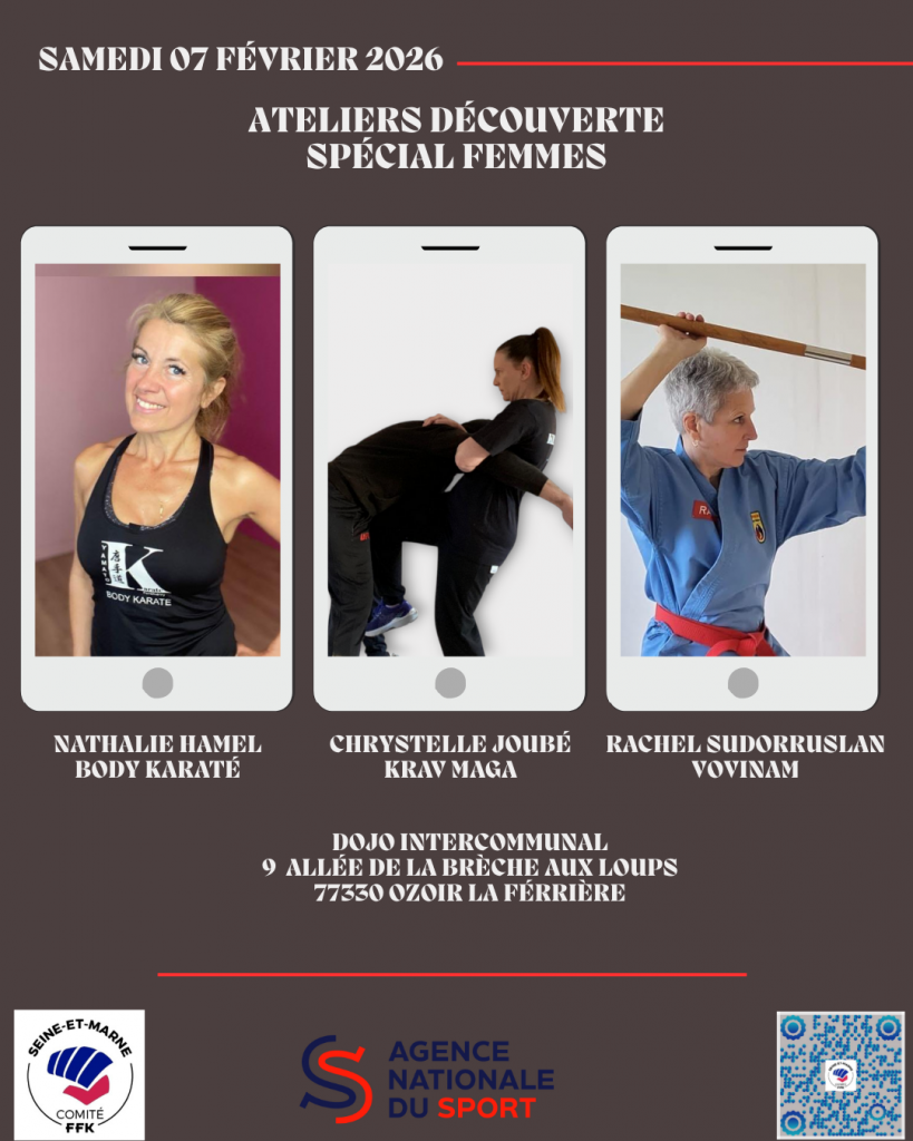 CDK77 ATELIERS DECOUVERTE 100% FEMININ Date Sam. 7 Février 2026 de 13h30 à 16h30 Lieu OZOIR LA FERRIEREDojo Intercommunal 9 allée de la brèche aux loups 77330 OZOIR LA FERRIERE