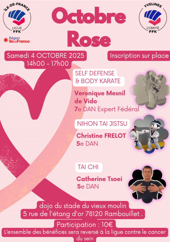 CDK78 ET LIGUE RIDF KARATE ET DA OCTOBRE ROSE Date Sam. 4 Octobre 2025 de 14h à 17h Lieu RAMBOUILLETGYMNASE DU VIEUX MOULIN 5 rue de l'étang d'or 78120 RAMBOUILLET