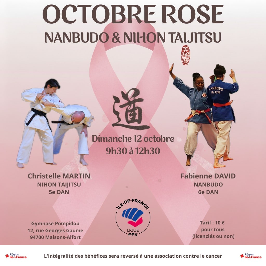 LRIDF KARATE ET DA OCTOBRE ROSE NANBUDO ET NIHON TAIJITSU Date Dim. 12 Octobre 2025 de 09h30 à 12h30 Lieu MAISONS-ALFORTGymnase Pompidou 94700 MAISONS-ALFORT