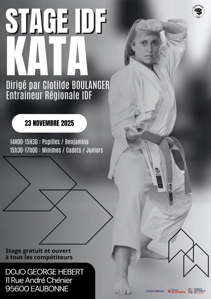 STAGE IDF KATA DIRIGE PAR CLOTILDE BOULANGER Date Dim. 23 Novembre 2025 de 14h à 17h Lieu EAUBONNEDOJO GEORGE HEBERT 12 rue André Chénier 95600 EAUBONNE