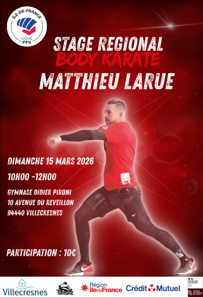 STAGE REGIONAL BODY KARATE DIRIGE PAR MATTHIEU LARUE Date Dim. 15 Mars 2026 de 10h à 12h Lieu VILLECRESNES10 RUE DU REVEILLON 94440 VILLECRESNES