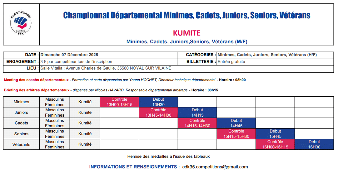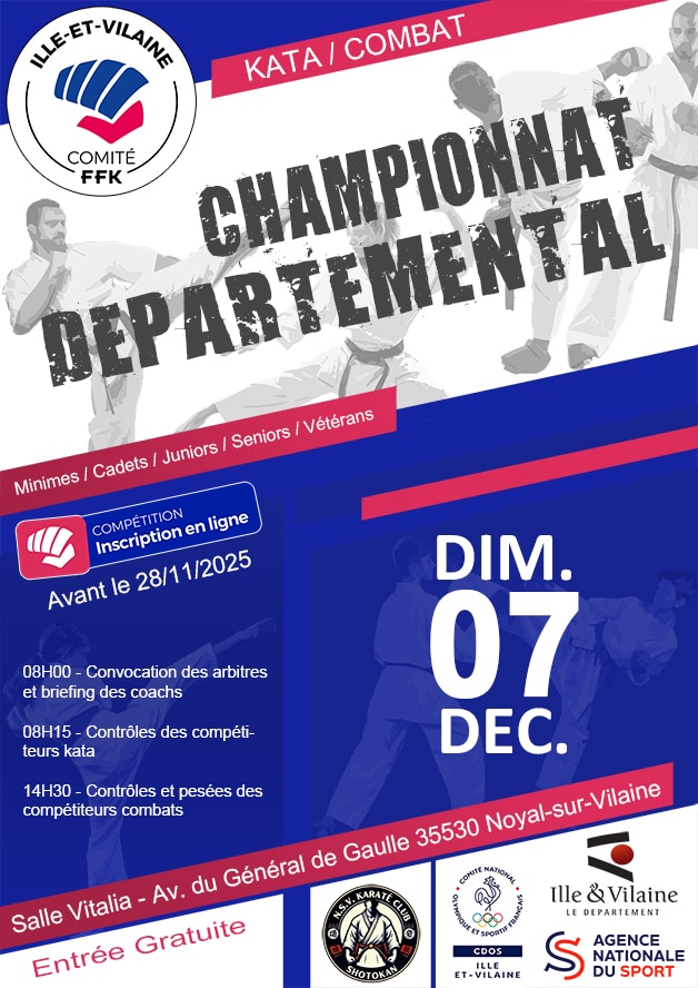 CHAMPIONNAT DEP MCJS – KUMITE Date Dim. 7 Décembre 2025 Lieu Salle VitaliaAVENUE DU GENERAL DE GAULLE 35530 NOYAL-SUR-VILAINE