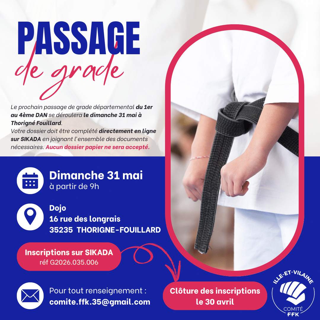 EXAMEN GRADES CDK 35 – MAI 2026 Date Dim. 31 Mai 2026 Lieu Complexe sportif Thorigné16 RUE DES LONGRAIS 35235 THORIGNE-FOUILLARD