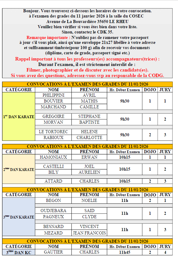 PASSAGE GRADE Date Dim. 11 Janvier 2026 Lieu LE RHEU (35)Salle du COSEC, Avenue de la Bouvardière 35650 Le Rheu
