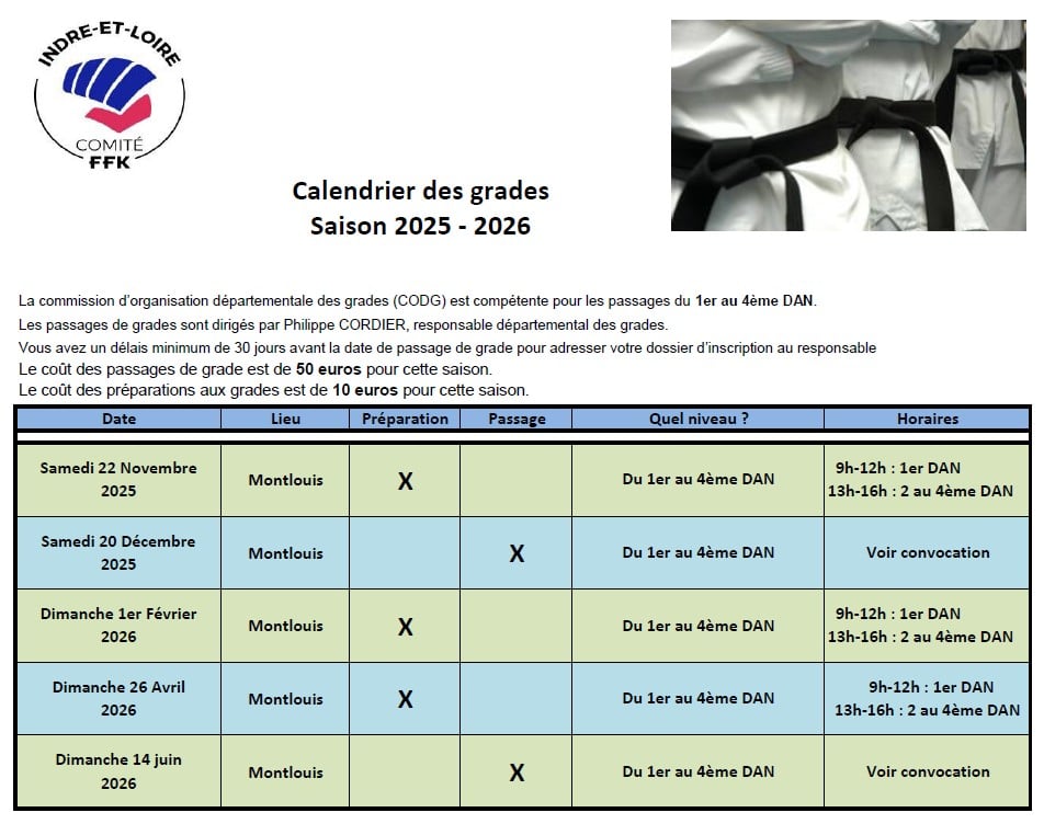 Changement de date : Passage de Grade 20 octobre 2025 Grades Le premier passage de grade du département se tiendra le SAMEDI 20 DECEMBRE à Montlouis