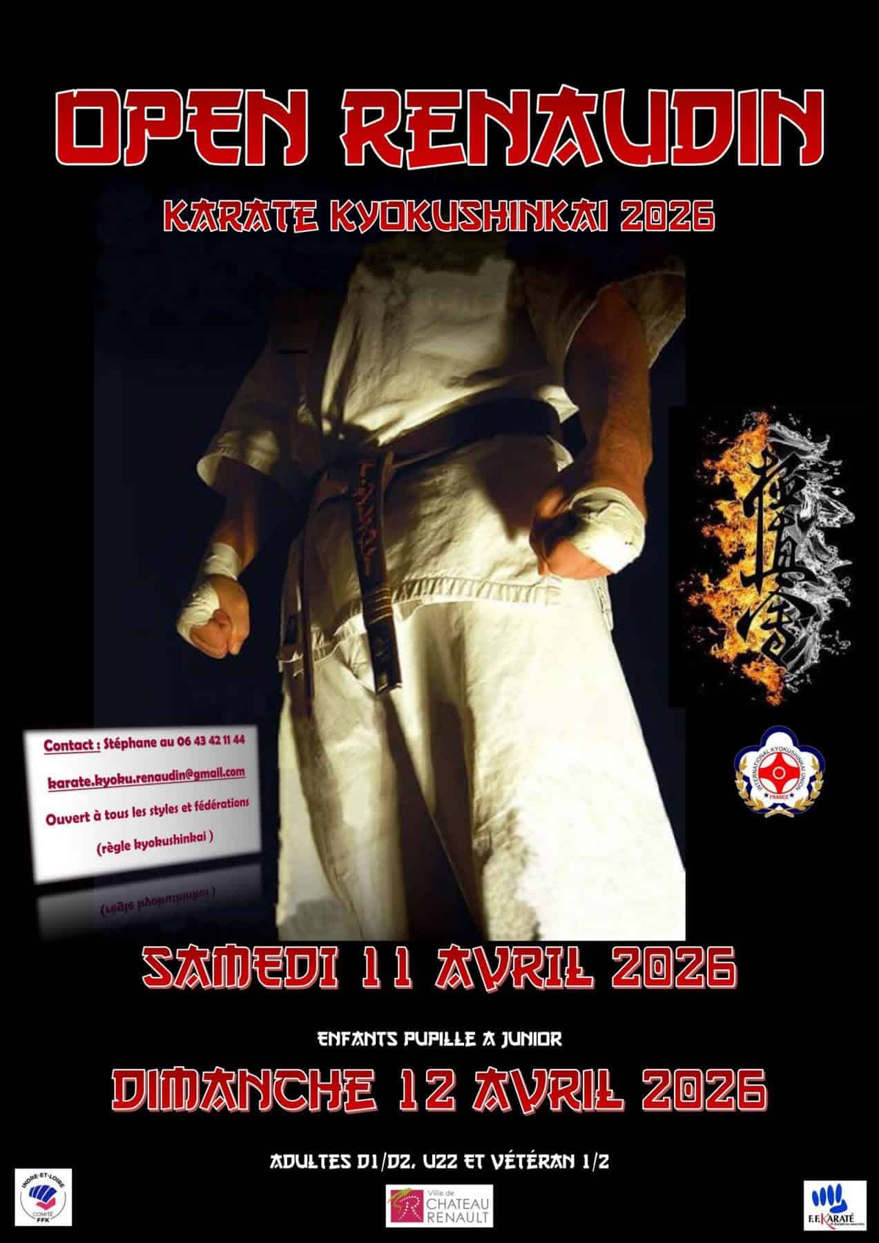 OPEN RENAUDIN Kyokushinkaï Date Du Sam. 11 au Dim. 12 Avril 2026 Lieu Gymnase, Rue de Torchanais 37110 CHATEAU-RENAULTKarate Kyoku Renaudin