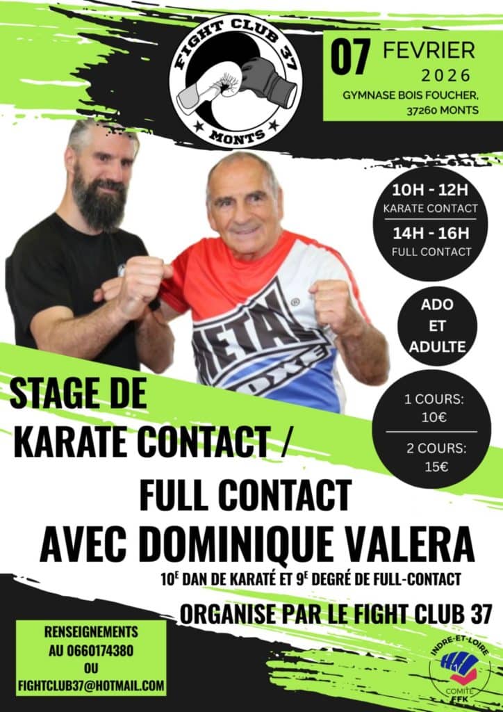 STAGE KARATE CONTACT / FULL CONTACT avec DOMINIQUE VALERA Date Sam. 7 Février 2026 de 10h à 16h Lieu Gymnase Bois Foucher - Rue Honoré de Balzac - 37260 MONTS