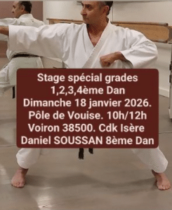 Le stage technique sera consacré aux passages de grades du 1er au 4ème dan. Il sera animé par Daniel SOUSSAN (8ème dan) et il se déroulera au pôle de Vouise à Voiron le dimanche 18 janvier de 10h à 12h.