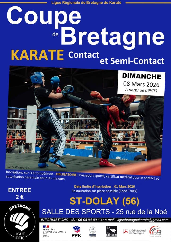 COUPE DE BRETAGNE KARATE CONTACT Date Dim. 8 Mars 2026 Lieu Complexe Sportif Saint Dolay25 RUE DE LA NOE 56130 SAINT-DOLAY