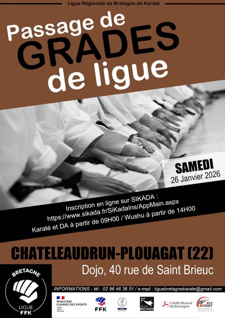 PASSAGE DE GRADES KARATE DO ET WUSHU Date Sam. 24 Janvier 2026 Lieu Dojo le Kube - Châtelaudren-PlouagatDojo le Kube, 40 rue de st Brieuc, Châtelaudren-Plouagat