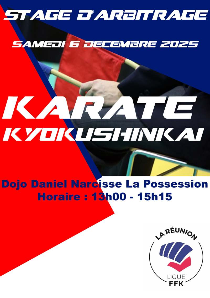 LIGUE : STAGE ARBITRAGE KYOKUSHINKAÏ DE 13H A 15H15 Date Sam. 6 Décembre 2025 Lieu GYMNASE DANIEL NARCISSE 97419 LA POSSESSION