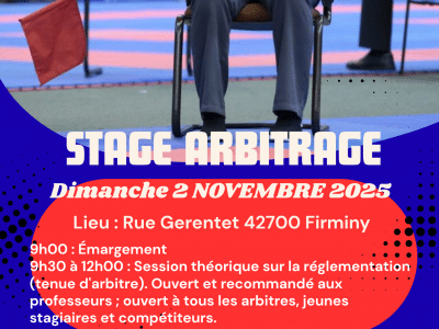 Stage d’arbitrage Stage d'arbitrage ouvert a tous les arbitres confirmés, stagiaires et jeunes arbitres mais aussi aux professeurs, présidents de clubs et les compétiteurs désirant s'informer sur la nouvelle réglementation. 19 octobre 2025 En savoir plus →
