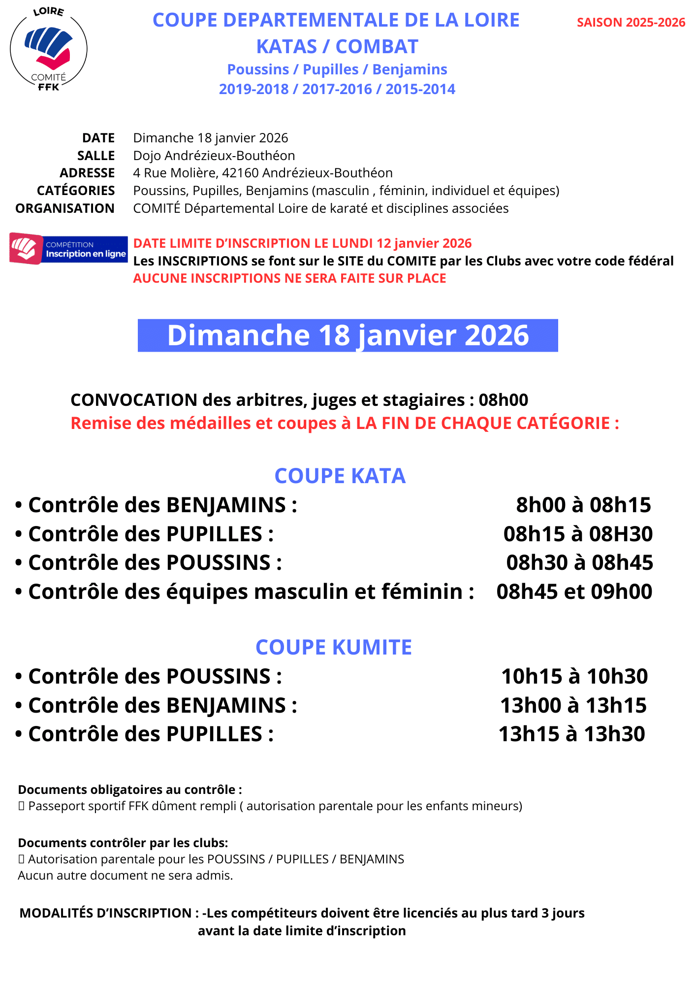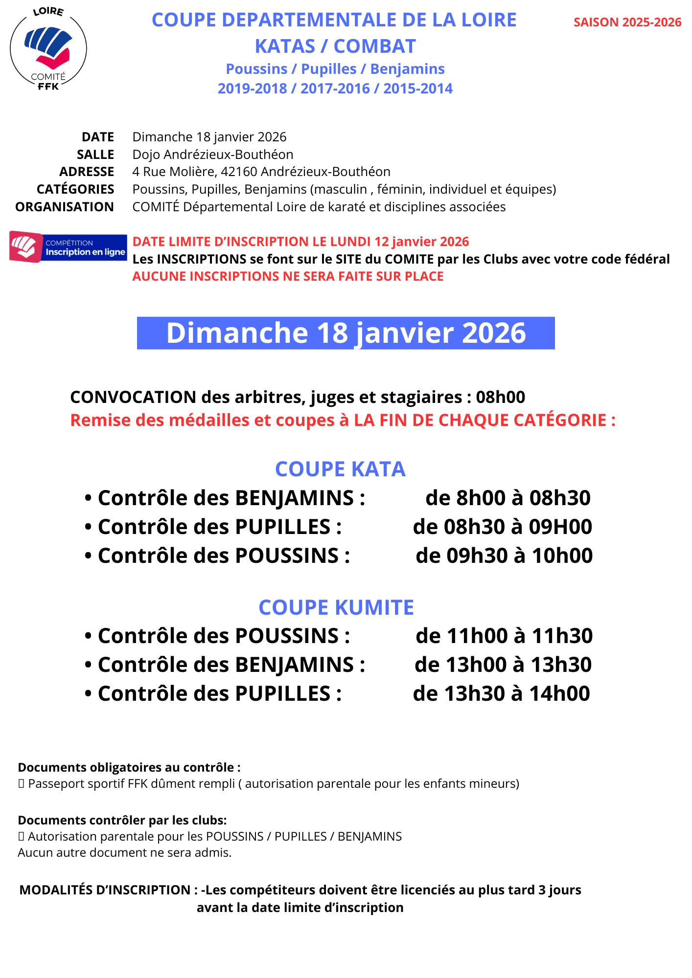 Coupe de la Loire PPB Katas combats Date Dim. 18 Janvier 2026 de 08h à 19h Lieu Andrézieux Coupe Loire PPB