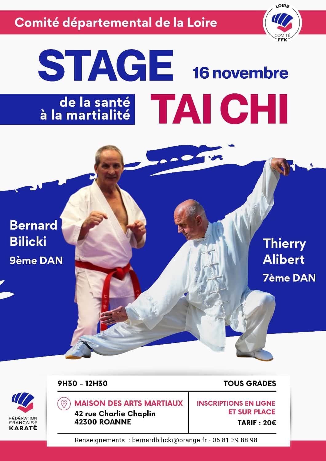 Stage Taï-Chi et Karaté avec Thierry Alibert 7ème dan et Bernard Bilicki 9ème dan Date Dim. 16 Novembre 2025 de 09h à 12h Lieu Roanne