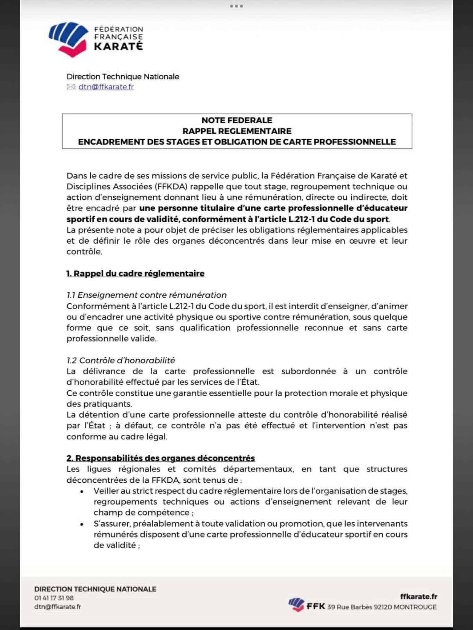Nous vous prions de bien vouloir trouver en pièce jointe la note du DTN par intérim relative au rappel des dispositions réglementaires concernant l’encadrement des stages, ainsi que l’obligation de détenir une carte professionnelle.